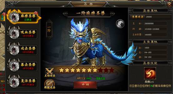 游戏中一共可以获得5只圣兽,圣兽通过VIP等级激活,VIP只需要完成任务即可免费升级