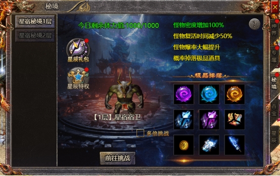 3、秘境怪物死亡会掉落魂骨和星辰玩法相关道具,挑战更高层数副本极品道具掉率增加。